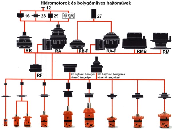 Hidromotorok és bolygóműves hajtóművekA Sauer-Danfoss hidromotorok jól illeszthetők az R.R. bolygóműves hajtóművekkel.Így még nagyobb nyomatékok és még kisebb fordulatszámok érhetők el. Különböző kapcsolóhüvelyek és illesztőperemek segítségével gyakorlatilag bármilyen Sauer-Danfoss hidromotor összeépíthető bármilyen R.R. hajtóművel.